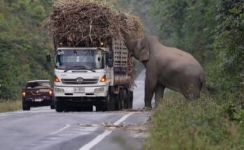 Greedy wild elephant stops passing trucks to steal sugarcane Read More